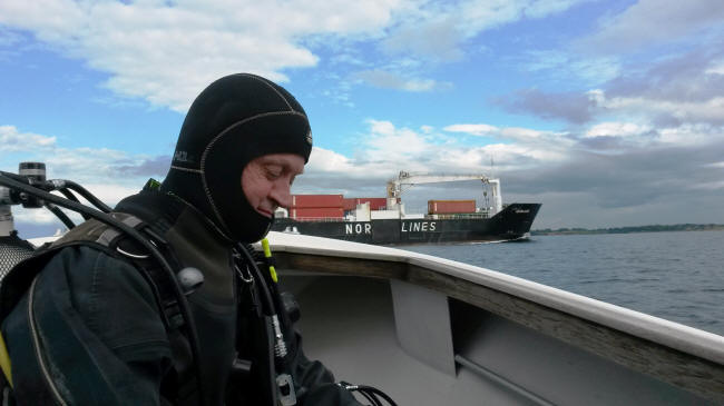 Malte og jeg fulgte efter, da vi havde gjort fast. Der var lidt strøm i overfladen, men den fortog sig på 8-10 m dybde. På vraget var der fin sigt, masser af fiskegrej, taskekrabber, store hårvarrer, havkaruser, forskellige flade og småtorsk. Jeg så måske endda en sorthvels den krøb så langt inde i et hul at det var lidt svært at arsbestemme den ud fra den spids af halen, der stak ud. Vi tog et par runder på indersiden og et par runder på ydersiden, inden det var tid til at komme op og tisse.. Jeg bjægede dog lige et fiskehjul på vejen. Det har en fiskende kollega nu overtaget renoveringen af.
