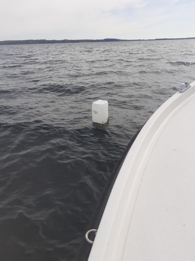 Som så ofte før krydsede vi Øresund og ankom på destinationen efter omkring 50 minutter, den smule vind der var i Rungsted aftog gradvist, så vi ankom i næsten stille, både hvad vind og hvad strøm angik, kunne vi se på dunken. Det er godt nok dejlig nemt med en fast fortøjningsbøje på vraget, men det tager også lidt af spændingen. Men nu kan det være mere spændende, end de fleste bryder sig om, at lande et uvist sted på Robert i 1 meter sigt og skulle bevæge sig gennem mistede fiskegarn for at finde et egnet sted at binde på. Så jo, den bøje er en rigtig god idé og lad os håbe den får lov at blive stående.