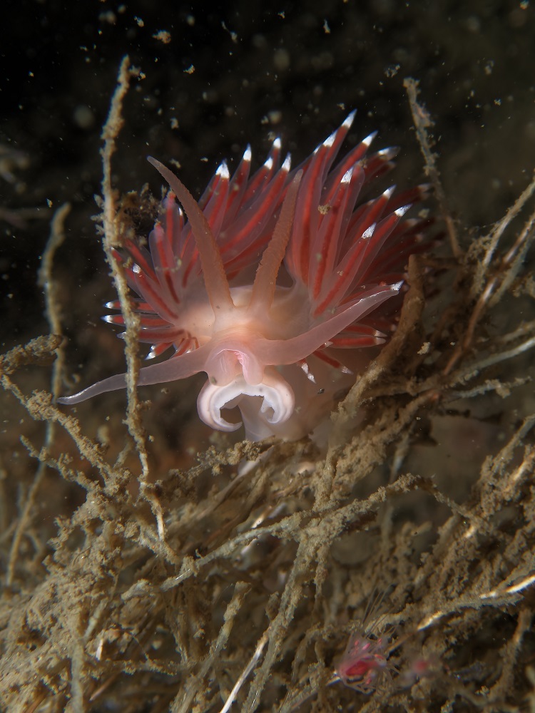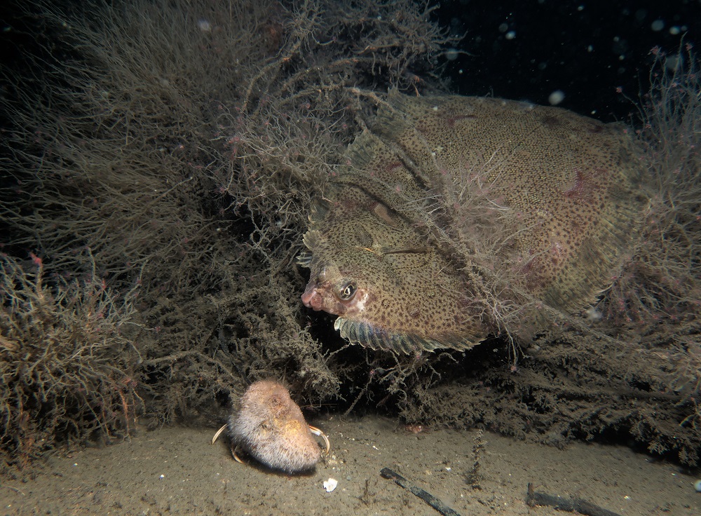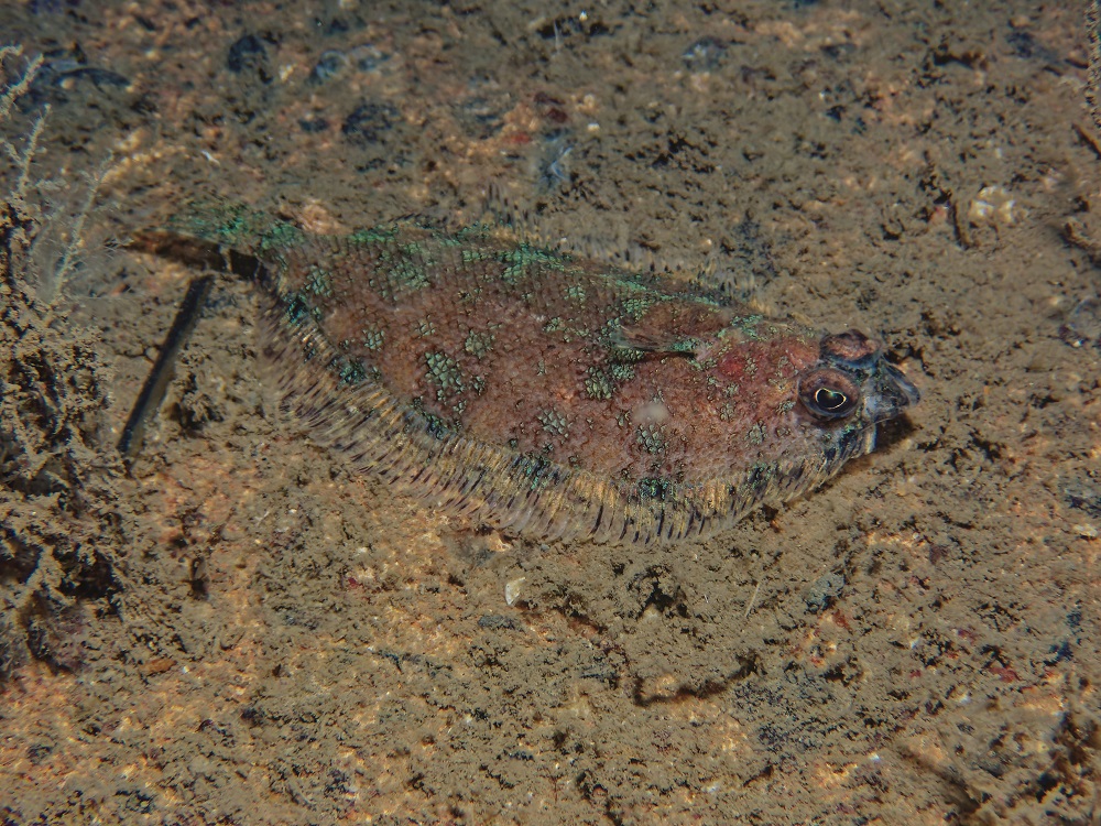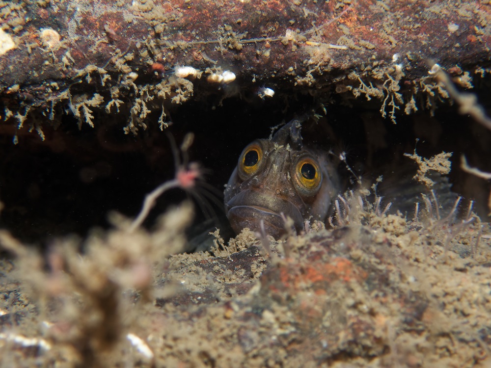 Det var mit eget første dyk på Robert, og mit indtryk var at det måtte være en af de dårlige dage mht. sigtbarhed (1-2m), men de andre kunne efter dykket fortælle at det var det overhovedet ikke. Jeg troede egentlig at jeg havde en aftale om en makker, men da jeg kom ned for enden af tovet var der ikke nogen. Min første indskydelse var at gå direkte op igen, men jeg valgte alligevel at prøve at følge skroget mod uret rundt i håb om at møde ham, og fordi et skrog jo er let at finde rundt om, og eventuelt tilbage ad – troede jeg.