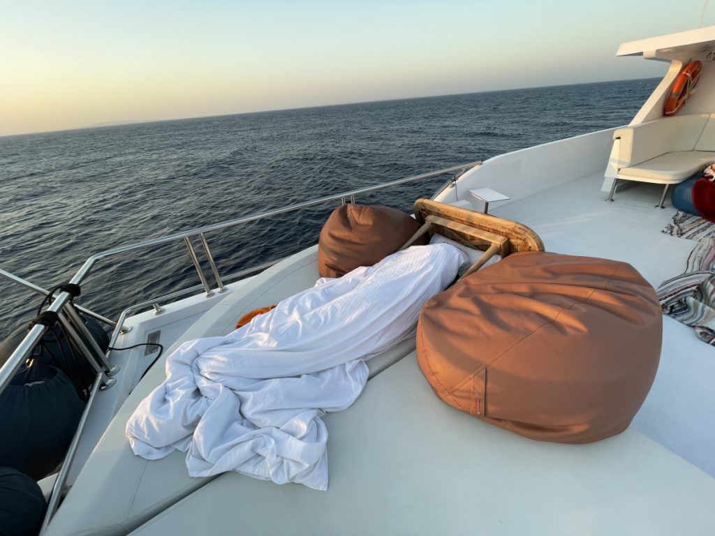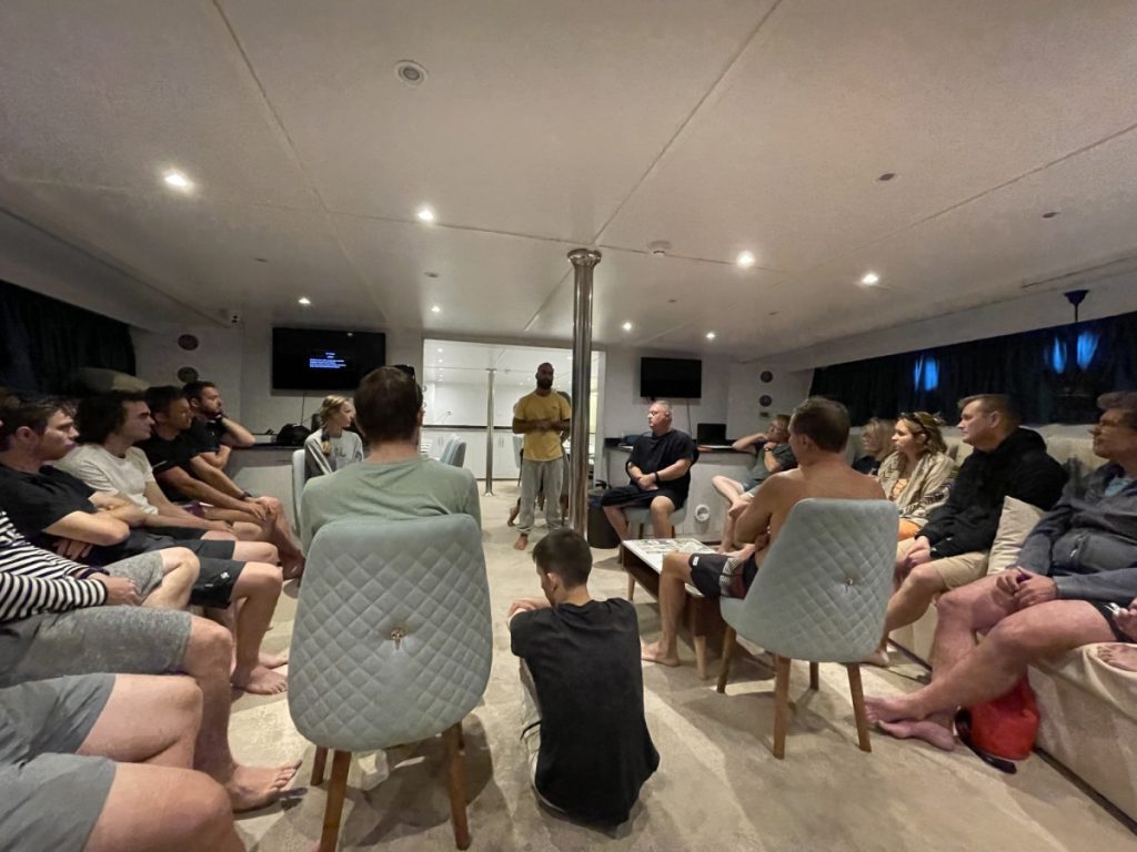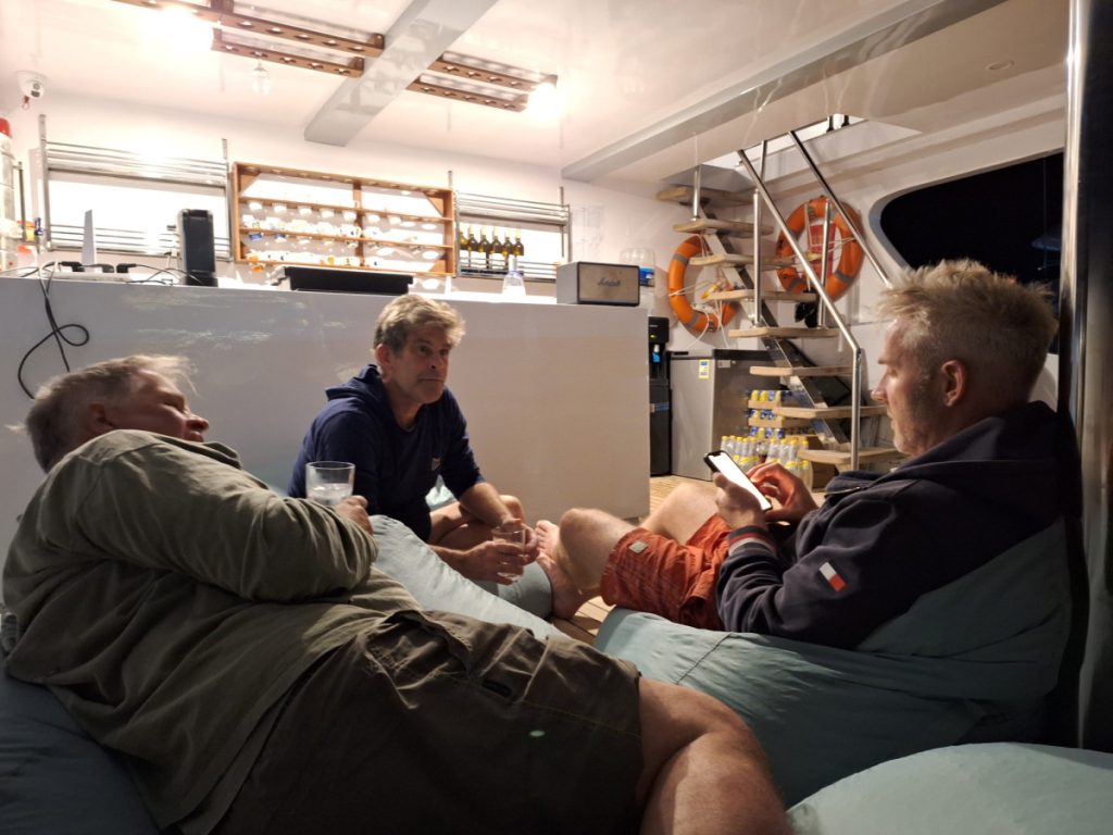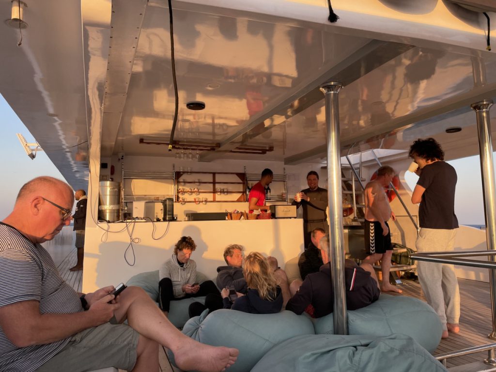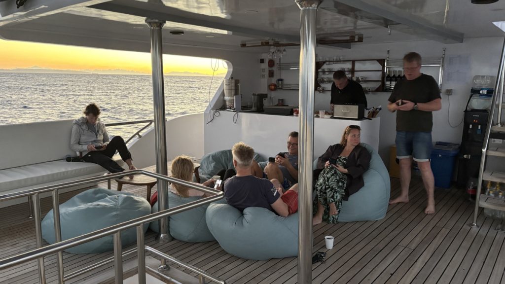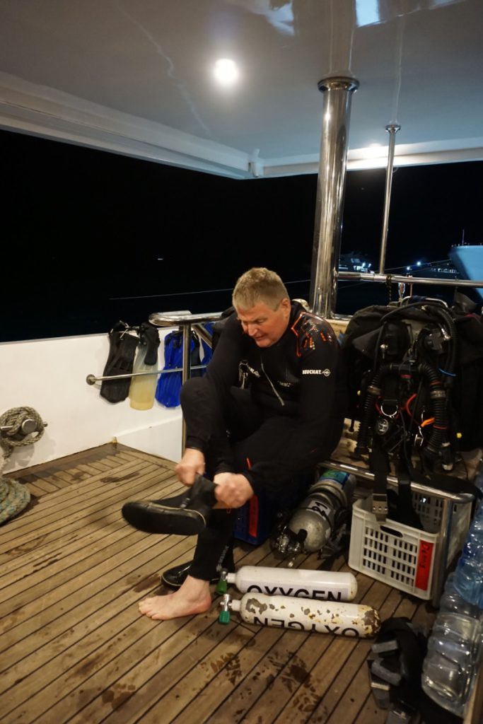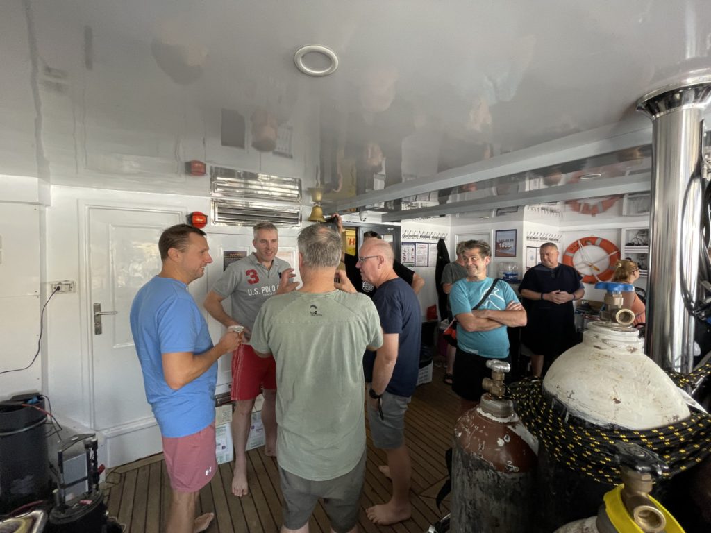 Vi skulle ellers have dykket natdyk på vraget, men strømmen skulle åbenbart tage til, så det blev aflyst. Det gav tid til at hygge på dækket hvor der blev spillet musik af meget svingende kvalitet…