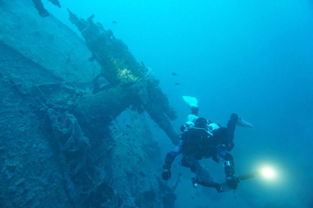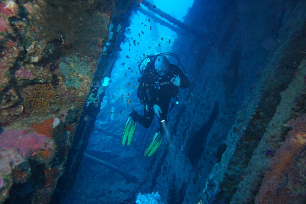 Dennis og de andre rebreathere dykkede uden tidsbegrænsning, og på den dybde giver en rebreather rigtig meget tid uden deko af betydning. Med tid nok gav det også god mulighed for at trække sig lidt tilbage og vente på at de par guidede ture vi mødte kunne passere. Det blev til lidt mere end to timer på vraget. Eller dvs. mest indeni, for der løb en heftig strøm henover vraget. Den sidste halve time var det tilmed mørkt. Så en slags natdyk blev det da til for nogle.