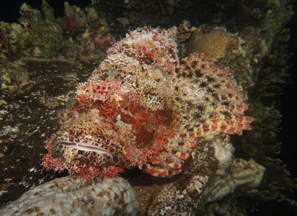 De mange dykkerne tog dog charmen fra dykket, men vi skulle lige se skorpionfisken, der lå på rælingen før vi gik op til den velfortjente øl og derefter drinks og aftensmad.
