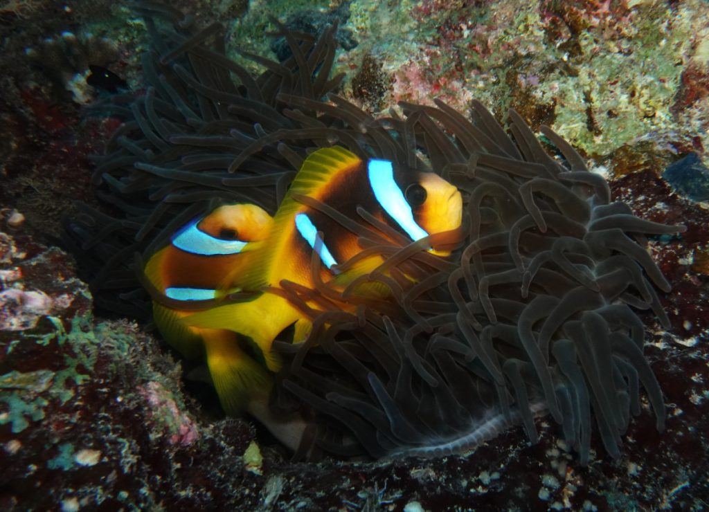 Syul-Vi hoppede i fra båden og så gik det ud mod et drop-off, hvor der lå et mindre vrag på kanten. Vraget var ret åbent og rummede ikke nogen seværdigheder af betydning. Herefter fik vi en længere tur nærmest rundt om hjørnet, hvor der var truet med stærk strøm som vi dog aldrig mødte. På vraget var der mange af de akvariefik, vi har set på hele ugen, ikke meget nyt, men alligevel ok. Vi så bl. a. en fluoriserende neonrød anemone med et par klovnfisk i oppe på væggen.