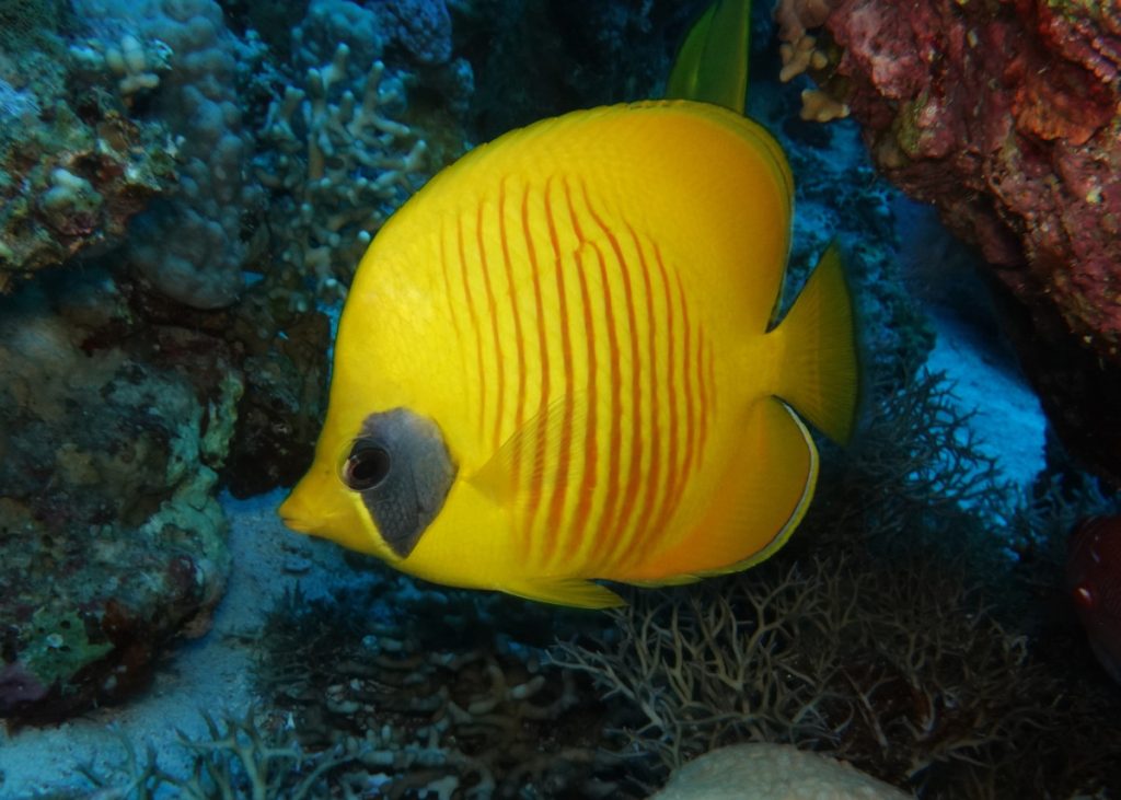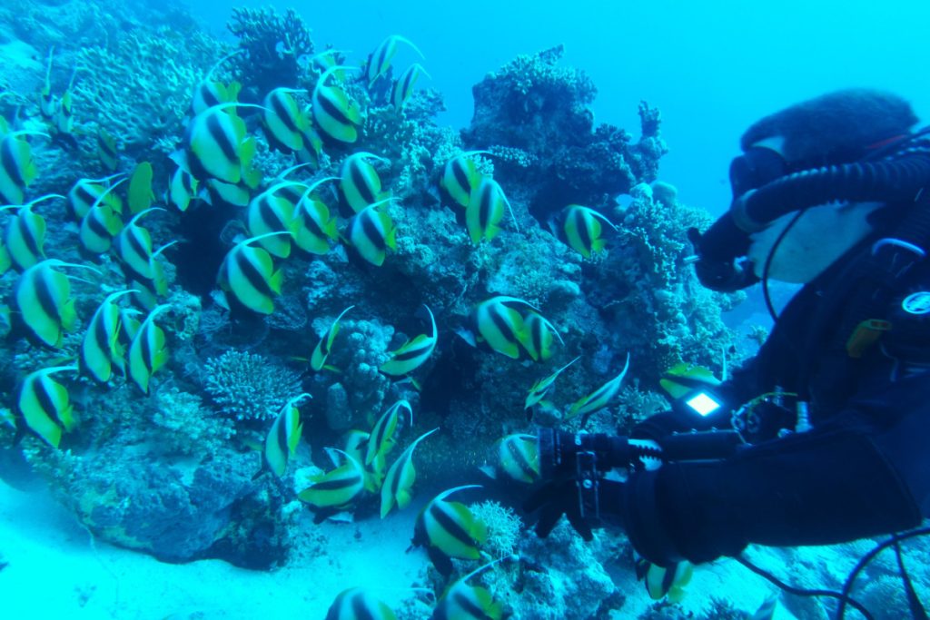 Vi hoppede i fra båden og hyggede os i en times tid med et stille og roligt dyk, med overraskende meget liv. Vi mødte bl. a. en stime Rødehavsvimpelfisk, hvor Dennis prøvede at blive en del af stimen – fiskene var ligeglade. Vi mødte også en lille gruppe de smukke ”purple kirurgfisk” og så en gruppe af de guleblåkindede (?) fanefisk., der tilsyneladende havde lystige tanker.