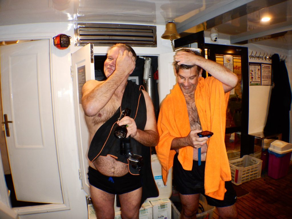 Oppe på båden blev udstyret nærmest pillet af os, skilt ad og skyllet og hængt til tørre. Besætningen gjorde sig umage med at fortjene drikkepengene! Og så kunne vi få en øl til frokost, inden vi skulle have eftermiddagen til at gå – uden at komme i vandet!