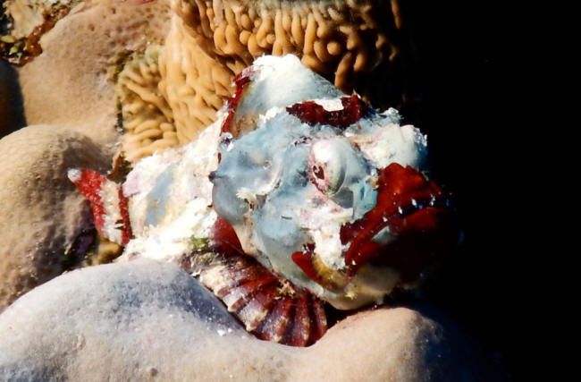 Vejret var stadigvæk blæsende og det gyngede noget, da vi sejlede mod dagens første destination. Vi skulle dykke på Habili Gaffar, et rev, der var ca. 35-40 meter i diameter og med stejle vægge hele vejen rundt. Vi var naturligvis ikke alene, men vi kom hurtigt i og det var egentlig ok i starten. Der var mange fisk omkring revet, bl. a. barracudaer, og over revet var der 3-5 meter, så der var også meget liv der. PIV fandt en stenfisk, der jo ikke ses så tit. Den her er ikke den bedst kamouflerede vi har set.