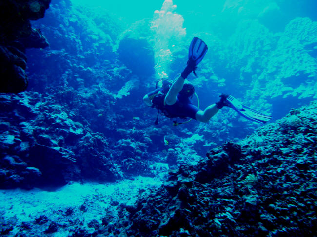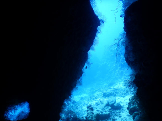 Så var det tid til lidt mad og endnu en sejltur. Denne gang til Umm Chararim- St. Johns Caves, hvor vi kunne dykke “huledyk”. Der var mange trange steder, hvor man kunne skrabe de dele af kroppen, der ikke var beklædt med neopren. Vægge og lofter i hulerne var tæt besat med koraller. Desværre var der ikke nogen af de tamme napoleonsfisk, der gad lege, selv om der var en nede ved bunden under båden.