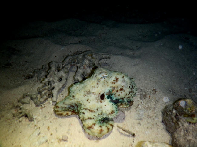 Efter vores huleeventyr skulle vi videre til vores natdyk, der igen skulle ske ved Sataya South. Fint bortset fra dragefisk, der bare var ligeglade med om de var inviteret eller ej. Der blev fundet en ottearmet blæksprutte, en puffet pufferfis, krabber og naturligvis rejer, snegle, og medusasøstjerner. Da vi var færdige med at dykke og sidste mand stod på stigen, dukkede der en oceanic op lige bag ham. Nogen af os var lige ved at nå i vandet igen, men guiden ville ikke gi os lov, så vi blev stoppet i springet. Det var i øvrigt den eneste gang vores dykning blev begrænset af guiden.