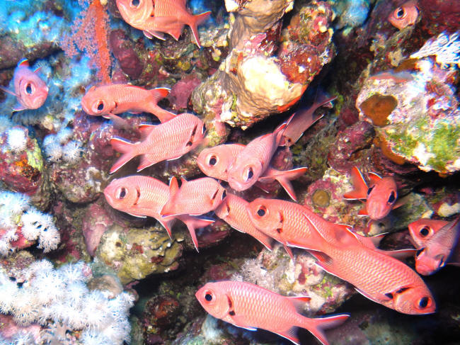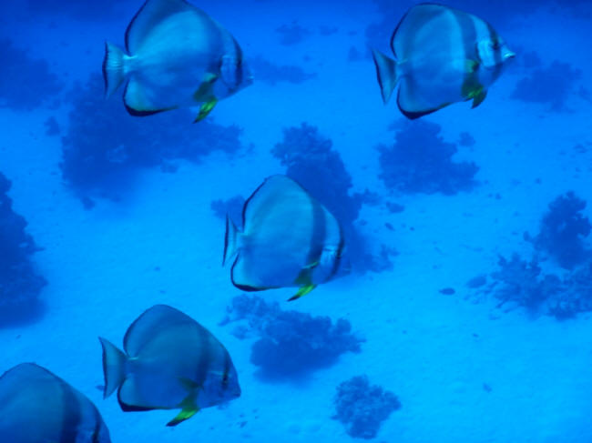 Op efter dykket, så vi kunne spise i læ, inden vi skulle sejle det meste af natten nordpå mod Elphinstone.Onsdag d 28/10Efter at have ligget lidt i læ bag et rev nogle timer, sejlede vi videre mod Elphinstone. Der var sen vækning, for planen var at tage første dyk mellem de allerførste og så dem der kom på dagtur. Dvs vi skulle først i vandet ca. 7:30. Elphinstone bød på 8 liveaboards og 5- 6 gummibåde fra land, så der var dømt jaccusi. Heldigvis var der en stor oceanic ved båden, så vi regnede jo nok med et ok dyk alligevel. Der var for meget strøm til en tur ud på nordspidsen, så vi blæste mod syd langs østsiden, hvor vi så en oceanic under bådene.