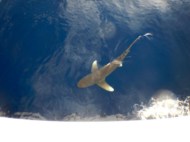 Og så blev turens første hajer ser, et par hvidtippede revhajer- en lille og en endnu mindre.