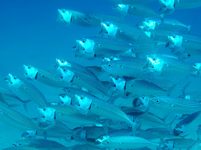 Check dyk ved Marsa Shouna. Klassisk bugt med søgræs og sandbund i midten. Og med de sædvanlige rygter om at der lige havde været en dygong. Ikke vildt ophidsende dyk, men så var vi ligesom i gang. Vi fandt en lille stime makreller, der svømmede rundt og filtrerede vandet med vidt åbent gab.