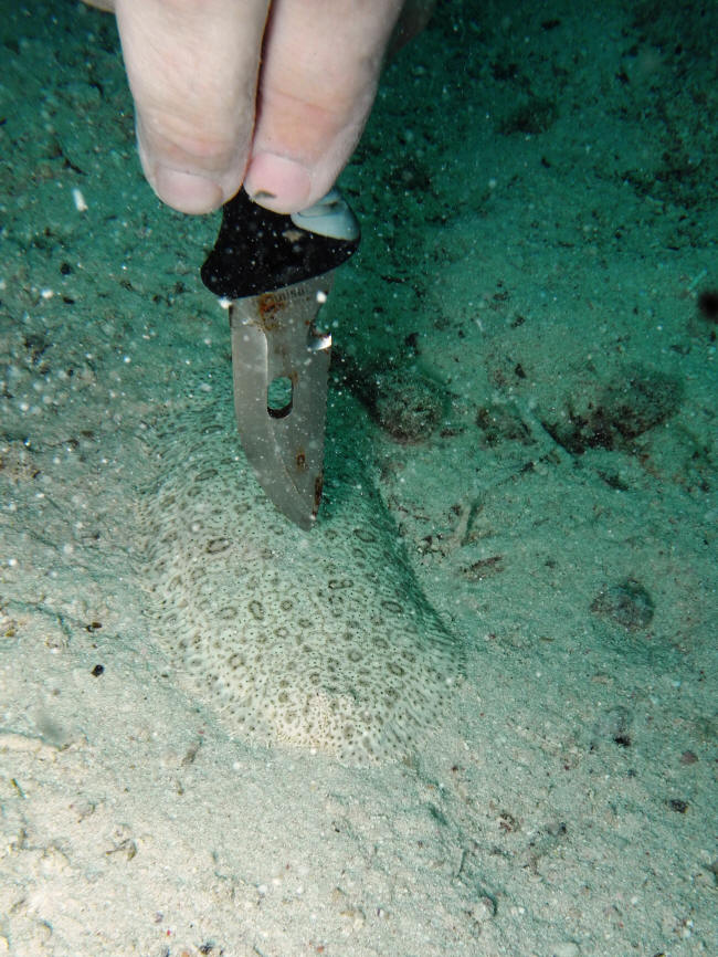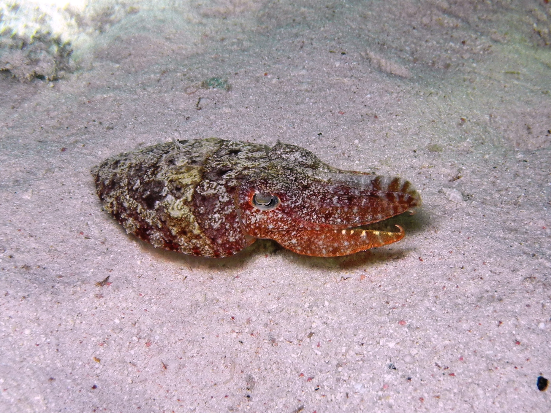 Efter eftermiddagsdykket skulle vi finde et sted at dykke natdyk. Det var ikke nemt, for vinden var ugunstig, så vi kunne ikke ligge på de kendte(ste) steder. Det endte med at vi dykkede på Dakara, hvor der var en revkant ned til 10 meters dybde og derefter en skrånende sandbund med spredte koraltoppe. der var mange medusastjerner og en del andet småkravl, bl. a. blækprutter igen. Det sjoveste var i slutningen af dykket, hvor der var en stor stime bittesmå fisk, der blev angrebet af større fisk og formede en bait-ball. Det så vildt ud og glimtede fantastisk i lygternes skær. Men godt at man ikke var en af de små fisk!