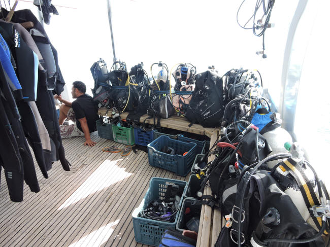 Vi var hurtigt tilbage i havn og så var det ellers bare med at ordne grejet, så det var klar til rejsen. Og så skulle vi lige drikke en enkelt øl. Og mens vi gjorde det, blev der råbt HAVBASSER nede fra kajen. Det var Lisbeth og Michael, som flere af os tidligere har rejst med på Maldiverne. De havde været på Brothers, Daedalus og Elphinstone og ævlede noget om en stime på 25 hammerhajer, men vi hørte ikke efter… Vi fik dog tid til at drikke en øl og udveksle erfaringer fra vores respektive ture, blot hørte vi ikke det med de 25 hammerhajer.