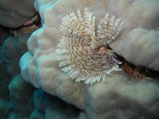Og så skulle vi sejle lidt, spise lidt morgenmad og gøre klar til den sidste tur i vandet. Turens enogtyvende og sidste dyk skulle være tæt på Port Ghalib. Først var det meningen, at vi skulle dykke ved Marsa Shouna igen, men nitten andre liveabords plus et par mindre både havde fået samme ide. I stedet valgte vi, dvs kaptajnen og guiden, at vi skulle dykke i en meget lille bugt Mahelek. Der var et fint rev på hjørnet og en skrånende sandbund, der desværre ikke viste mange tegn på større dyr. Revet var fyldt med det det sædvanlige, og der var masser af makroliv, for dem, der syntes det var sjovt, bl.a. masser af små pipefish og børsteorme.