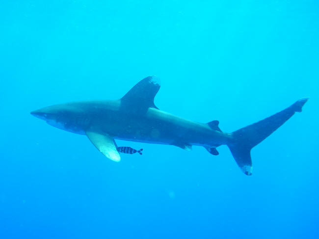 Den blev omkring gummibåden, der skulle hente os, men vi havde ikke travlt, for vi havde jo lige fået en ny ven… En shark-wannabe med orange svømmefødder blev i øvrigt set under det meste af dykket…