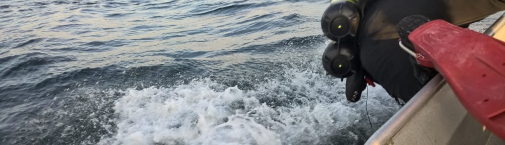 Op i båden igen og få styr på stumperne – alt imens at Jørgen og Eskil overhalede mig.. Nå men i vandet kom jeg til sidst og var mere eller mindre tør og uden løse flasker. Der var lidt strøm helt ned til 2-3 meter over vraget hvor der stort set var strøm-stille og desuden var der formidabel sigt!