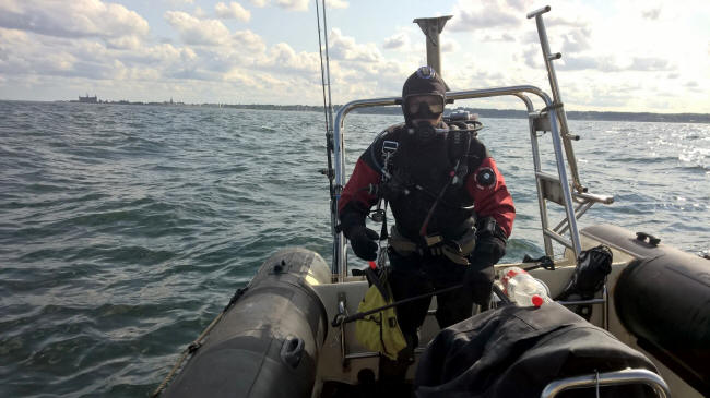 Da jeg nåede havnen lidt i 16.00, var Lille Jensen og Steffen klar til at sætte båden i vandet. I med kortet og i med båden, alt i mens vi fik ordnet logistikken med de andre, og at de selv skulle tage båd med osv. Vi fik hurtig pakket båd og så af sted ud af havnen mod Otto. Fremme ved positionen gjorde Steffen klar til at binde på, og ved det andet lodkast mente vi, at loddet måtte ligge på vraget. I med Steffen og så vente de obligatoriske 10 minutter før tovet kunne gøres fast. Det gik alt sammen ganske fint, selv om der var noget mere vind og bølger end vi havde regnet med. Til gengæld var der overhovedet ingen strøm i overfladen.