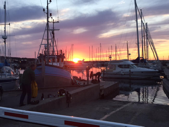 Nå men alt gik jo godt selv, om Jørgen havde sine kvaler med stigen og indstigning i båden. Så var det tid til en velfortjent øl, mens Kim fik bundet af og kom på stigen. Vi fik ankertorvet op og sendt Havtasken med Malte og Steffen i forvejen. Dem overhalede vi så lige før havneindsejlingen 🙂 Tilbage i havnen fik vi læsset af og pakket, selv om jeg selv lige måtte tage tredje dykket i haven efter min bilnøgle. Surt! Den blev fundet og har virket lige siden uden problemer. Det er jo en Kia 😉