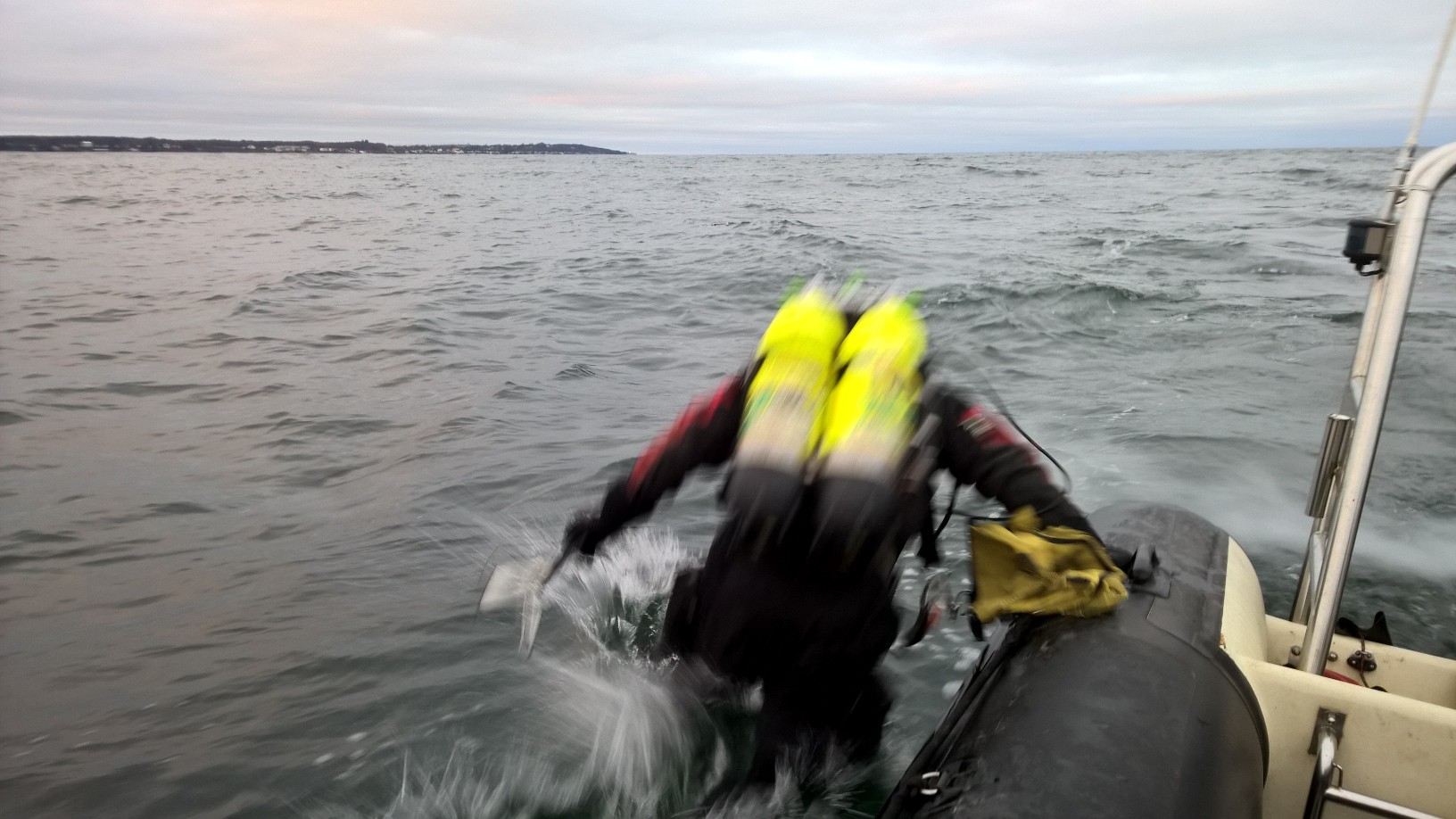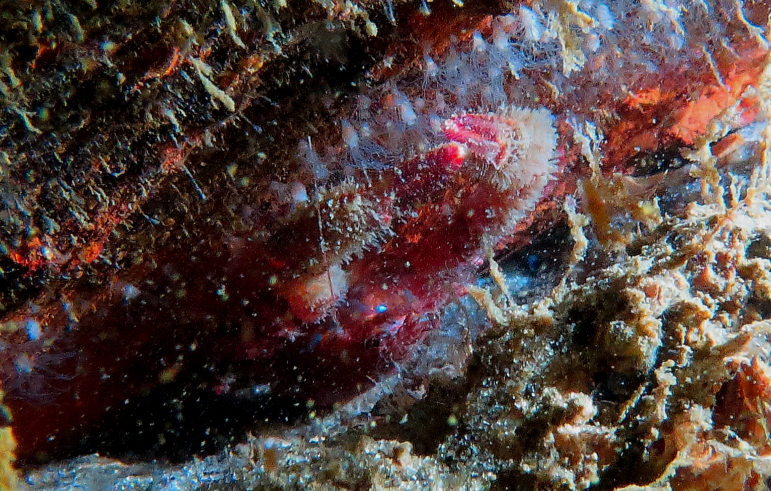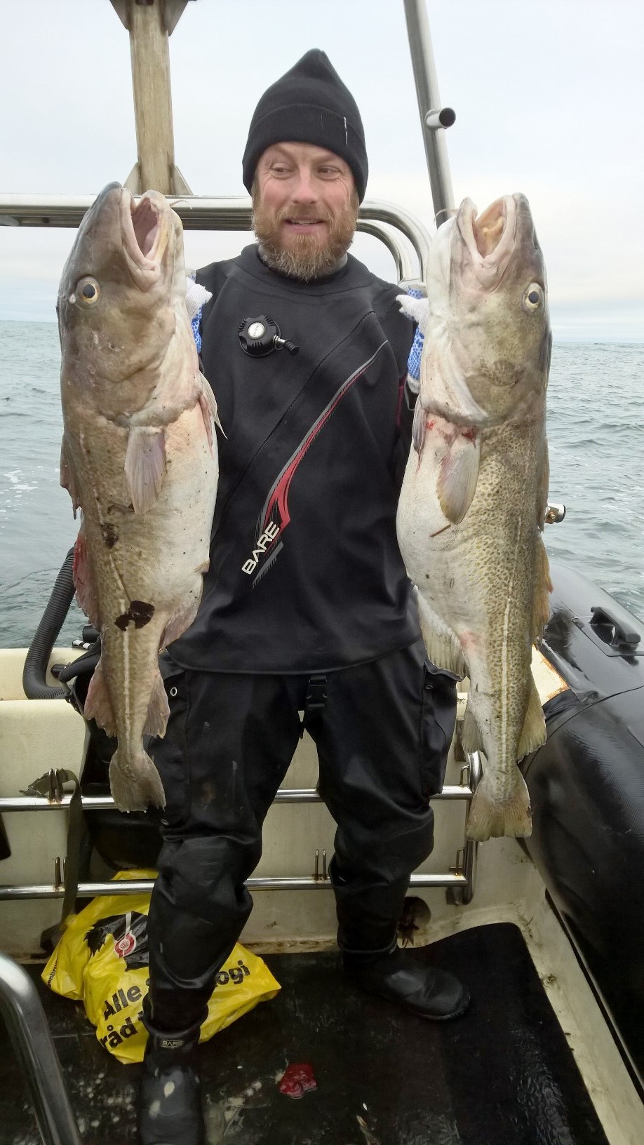 Jeg skulle lige trække mig ned de første 6-8 meter, hvorefter det blev helt stille. På vraget var der en svag sydgående strøm, men ikke noget af betydning. Til gengæld var sigten nærmest formidabel. Hvis man lagde sig midtskibs kunne man se rælingen på begge sider:) Henrik havde bundet på den bagerste david i styrbords side. Så det var nænt. Af sted gik turen stille og roligt ud i stævnen og studere anker m.m. Det er tydeligt at stævnen er begyndt at falde sammen og frem af. På vejen mødte jeg bl.a. en enkel stor berggylt og frit svømmende torsk. De var absolut ikke kælne og ville bestemt ikke med op. Herefter gik turen ned agter og studere den sammensunkne – væltede agterende. Svellerne ligge helt frit fremme, og jeg kunne se indtil flere torsk gemme sig i dem. Alt mudderet er blæst ud af vraget og der er kun sand på den. Der var en hel del tråd nøgensnegle, småfisk og fiskeyngel. Så var tiden ved at være gået, og jeg fandt tilbage til bundtorvet. Jeg blev overhalet af Henrik på tovet med posen fuld af torsk. Jeg nåede op i strømmen og lå og blæste op og ned og kunne mærke tovet dirre, når tovet blev strammet op ved dønningerne. Mens jeg lå der, kom Steffen og Peter forbi på vej ned. Jeg nåede stigen, eller rettere forbi stigen og måtte tage en taxatur:) Steffen havde betænksomt bundet et tov fast i sigens nederste trin og frem, for ikke stigen skulle knække. Nå, men op kom jeg 🙂