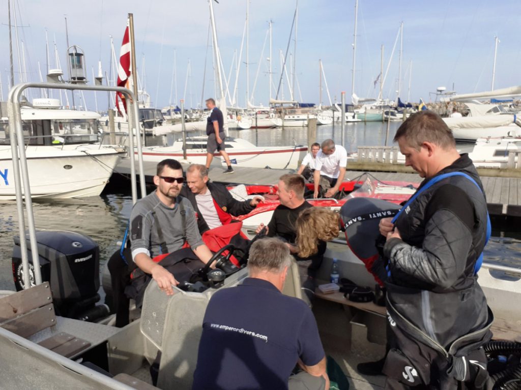 Med båden i vandet blev båden hurtigt fyldt.. Anders kiggede noget på os da flere af os trak dragterne både halvt og helt på – det er tydeligt at han stadig er ny gast i Havgassen… Man kan dog godt forstå ham – for denne dag var det både varmt og aldeles vindstille så det var egentlig ikke rart med overtøjet på.