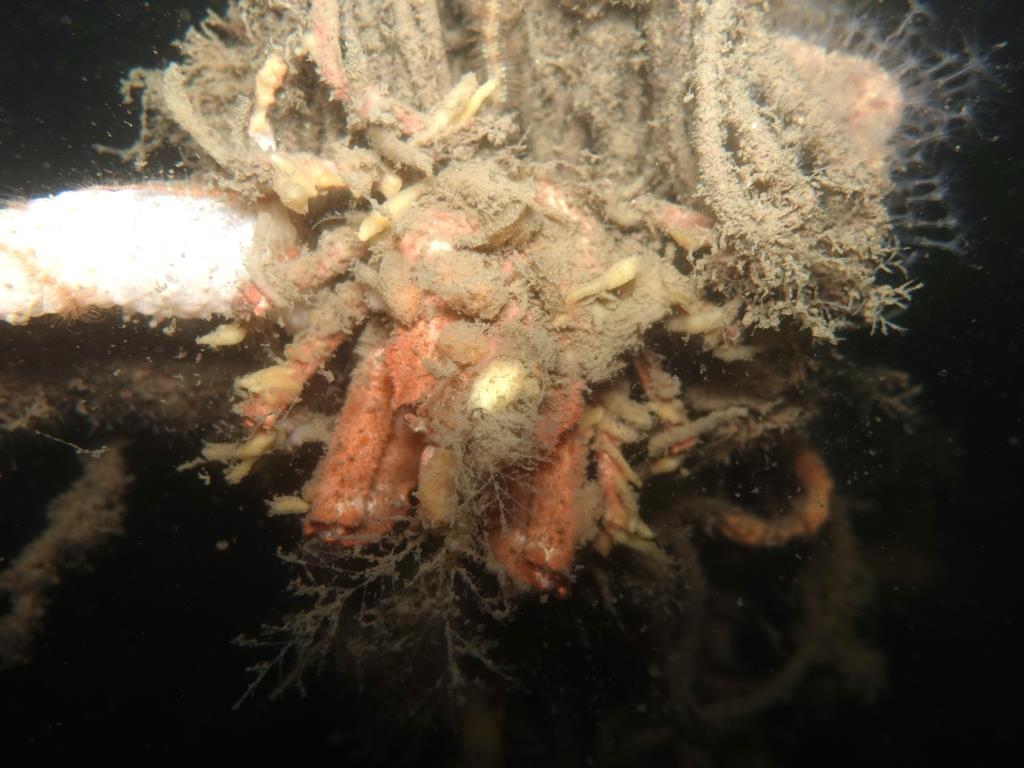 Jeg fortsatte min rundtur på vraget og rundt om det – der var utrolig mange taskekrabber over det hele – en del af dem sad fast i net og liner…. ud fra det man ser kan man jo en gang imellem undre sig over at UV-jagt er forbudt men det er tilladt at svine vrag til med liner, plastik og kroge.