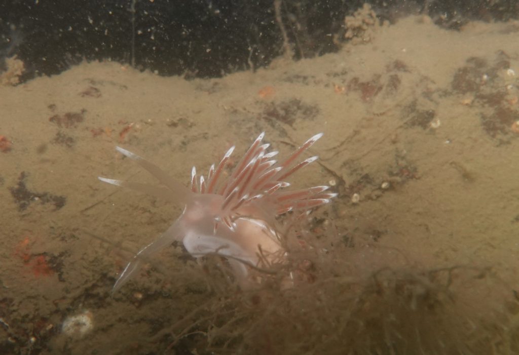 Da jeg hoppede i, var vandet uklart i overfladen og det blev mere og mere gult og uklart ned til springlaget. Under springlaget forsvandt den gule farve og den dårlige sigt blev yderligere forringet. Stroberne, der sad på bundtovet, gjorde ikke meget væsen af sig, dertil var sigten simpelt hen for ringe, under en halv meter, så man skulle have computeren helt op til masken for at se noget, hvilket ikke er en fordel, når man ikke har styrke i masken…