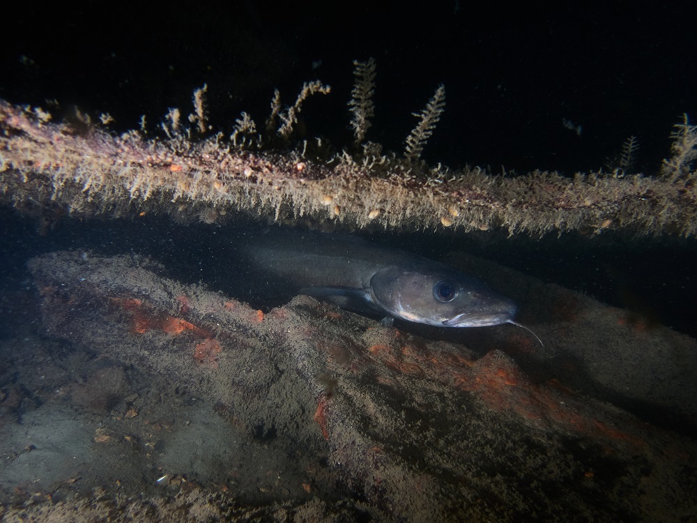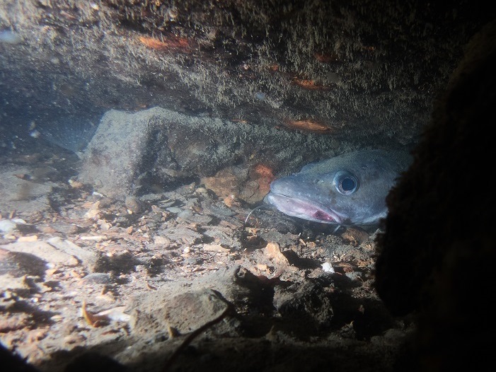 Men uagtet sigten var der et mylder af liv – især taskekrabber, torsk og langer stod i alle huller – og mange af småtorskene var også frit svømmende på det meste af vraget – men der var nu også pænt med nøgensnegle, buskhoveder, langfingerkrebs og alt muligt andet.