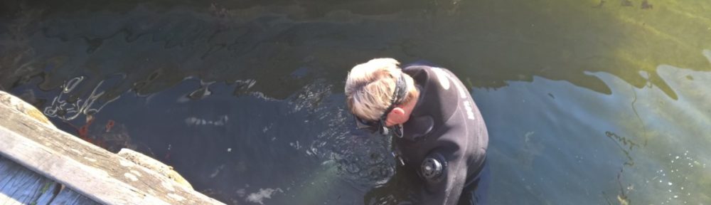 Inden jeg fik snøvlet mig færdig kom Kirsten op med min hætte og jeg stak mod bunden. Mærkede straks lidt vand i handsken, rettede lidt på det hele og synes det stoppede. På bunden var forholdende som PIV havde beskrevet. En smule strøm, ikke mange meter sigt og masser af nøgensnegle.