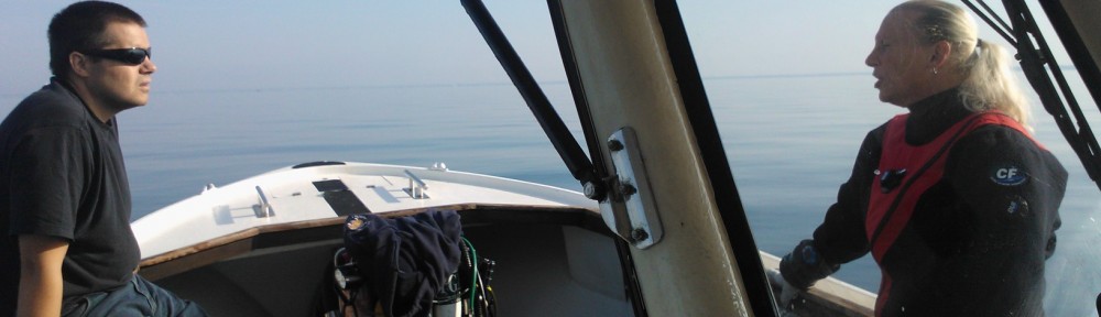 “Kutter-ekspedition” En åben invitation fra Store Jensen resulterede, at hans båd blev bestykket med alt fra historisk udrustning, over hobby og hardcore, til hightec dykker grej; Hestesko, BCD, enkeltflaske, dobbelt sæt, rebreather – vi havde stort set det hele med. Det for mig nye trick bestod i at torvværk ikke var opfundet, for vejret var så godt at båden belv fyldt mens den var let ved kaj. Således hurtigt afsted kunne vi stå ud over et blankt øresund.