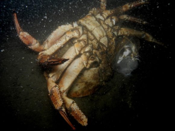 Derfra stod den på opdagelse på vraget. Midtskibs er som sagt helt ødelagt, men lasten, der har ligget i sække er der endnu, og giver mange huler og revner der er fyldt med store krabber og torsk. De to ender er temmelig intakte, og sigten her var også en smule bedre..